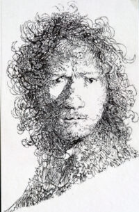 Opera realizzata da Filippo Mattarozzi, disegnatore autodidatta specializzato nella riproduzione di incisioni antiche con inchiostro e matita. La sua tecnica, estremamente raffinata e meticolosa, porta spesso a confondere i suoi lavori con stampe originali del XVII secolo. Questo disegno, che riprende un soggetto di Rembrandt, si distingue per l’intensità espressiva e la fedeltà alla tradizione incisoria del maestro olandese, pur mantenendo una qualità autonoma e contemporanea.