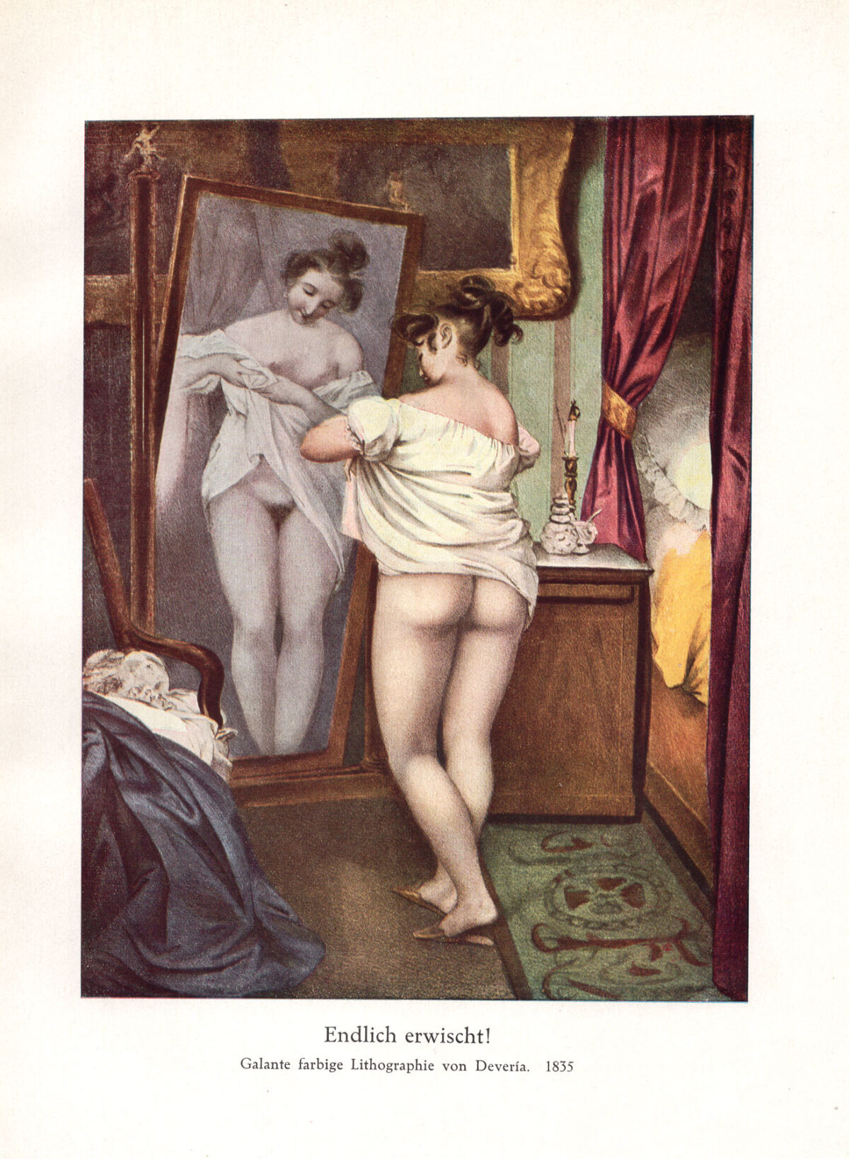 Finalmente catturato! Litografia colorata galante di Deveria. 1835 stampa erotica