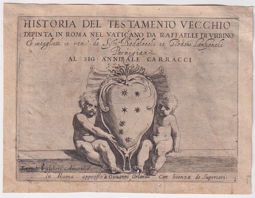 This frontespizio è parte della History of the Old Testament, painted in Rome in the Vatican by Raphael of Urbino and carved in copper by Sisto Badalocchi and Giovanni Lanfranchi for Mr. Annibale Carracci.
