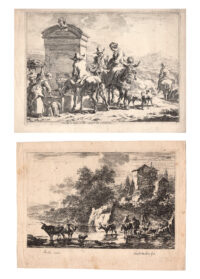 Nicolaes Berchem (o Berghem) (XVII) – Contadini alla fontana e Buoi e animali al fiume, 1655. Acquaforte – Firmato su lastra – 1655 Berchem Nicolaes (o Berghem) (1620-1683), Coppia di acqueforti su carta vergellata, con contadini ed animali.