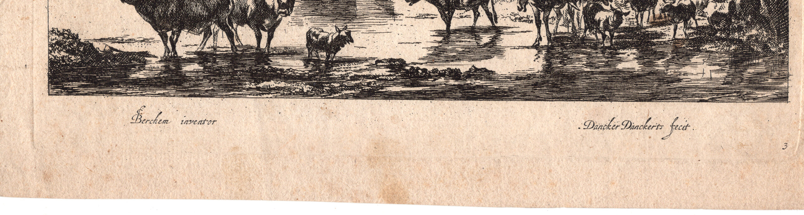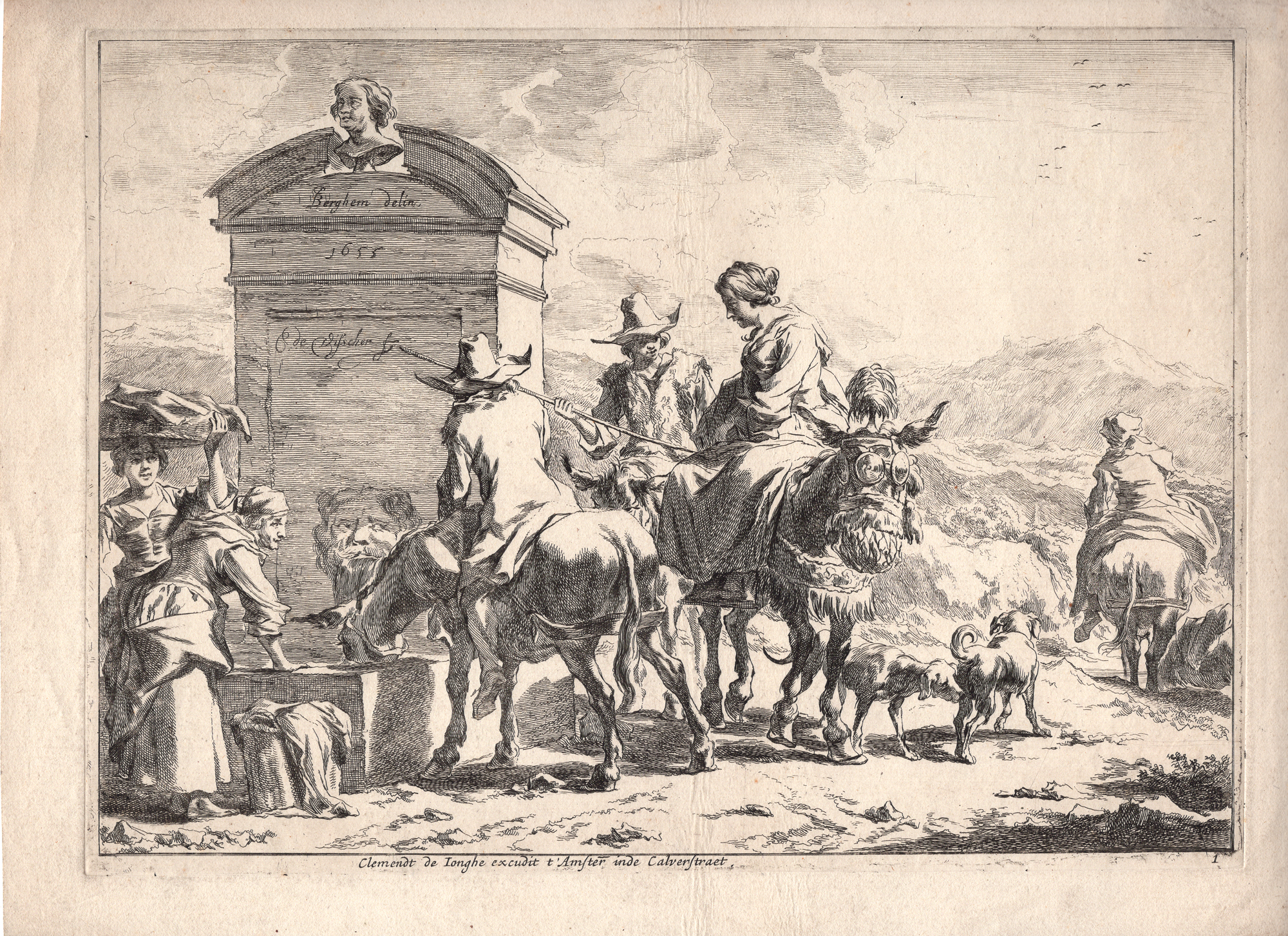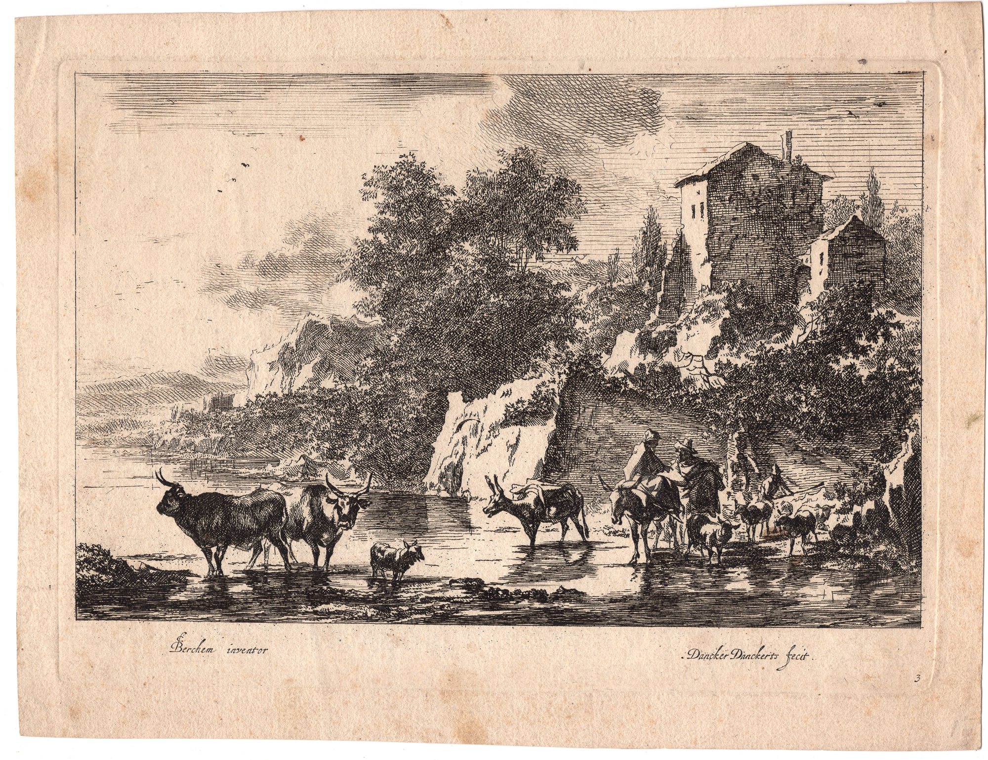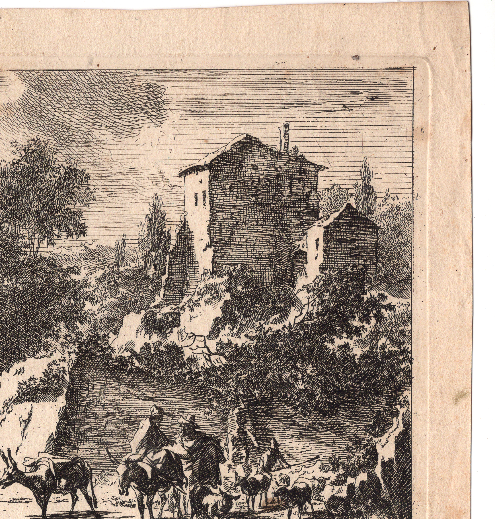Acquaforte su carta vergellata cm 17×25 alla battuta del rame su foglio cm. 20×27; cm.20×27 alla battuta del rame su foglio cm.23×30. In alto a sinistra in lastra si legge Berghem delin. 1655, e in basso a sinistra Berchem invent. Ottime condizioni.