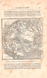 Questa affascinante stampa xilografica illustra una rappresentazione antica delle costellazioni, accompagnata da testo descrittivo. L’incisione è parte di una pagina originale del celebre trattato astronomico di Flammarion, autore noto per la sua opera di divulgazione scientifica. La pagina ha testo intorno all’immagine e sul verso.