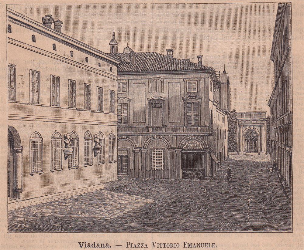 Viadana, Mantua, 1890 it's a woodblock print representing Piazza Vittorio Emanuele in Viadana, built in 1890.