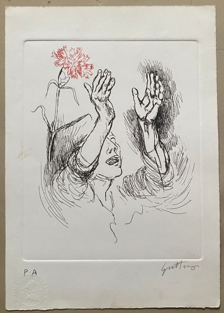 Questo lavoro, firmato in basso a sinistra, misura cm. 17,5×16,5 ed è incollato ai margini superiori su un cartoncino spesso.
