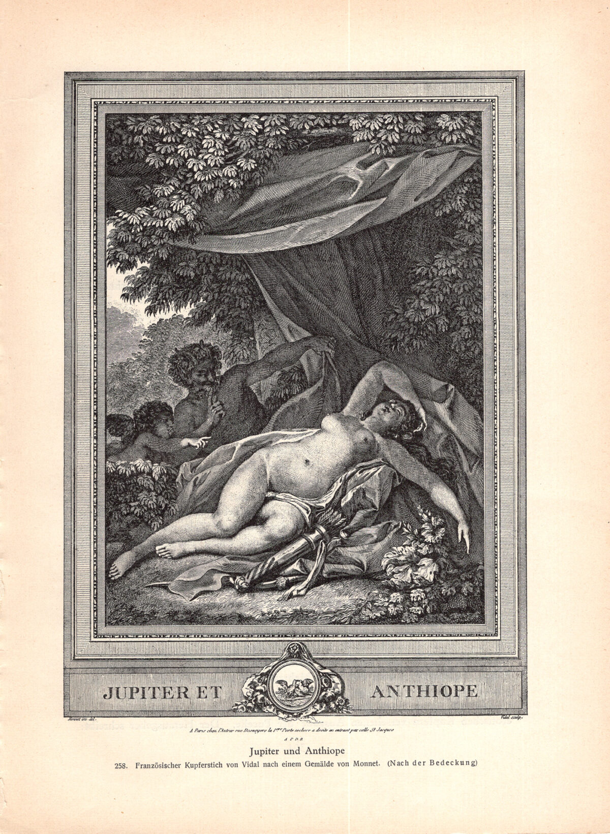 Stampa litografica a colori che riproduce una scena in cui Antiope si mostra nuda e Giove che ha assunto le sembianze di un Satiro, la vuole sedurre.