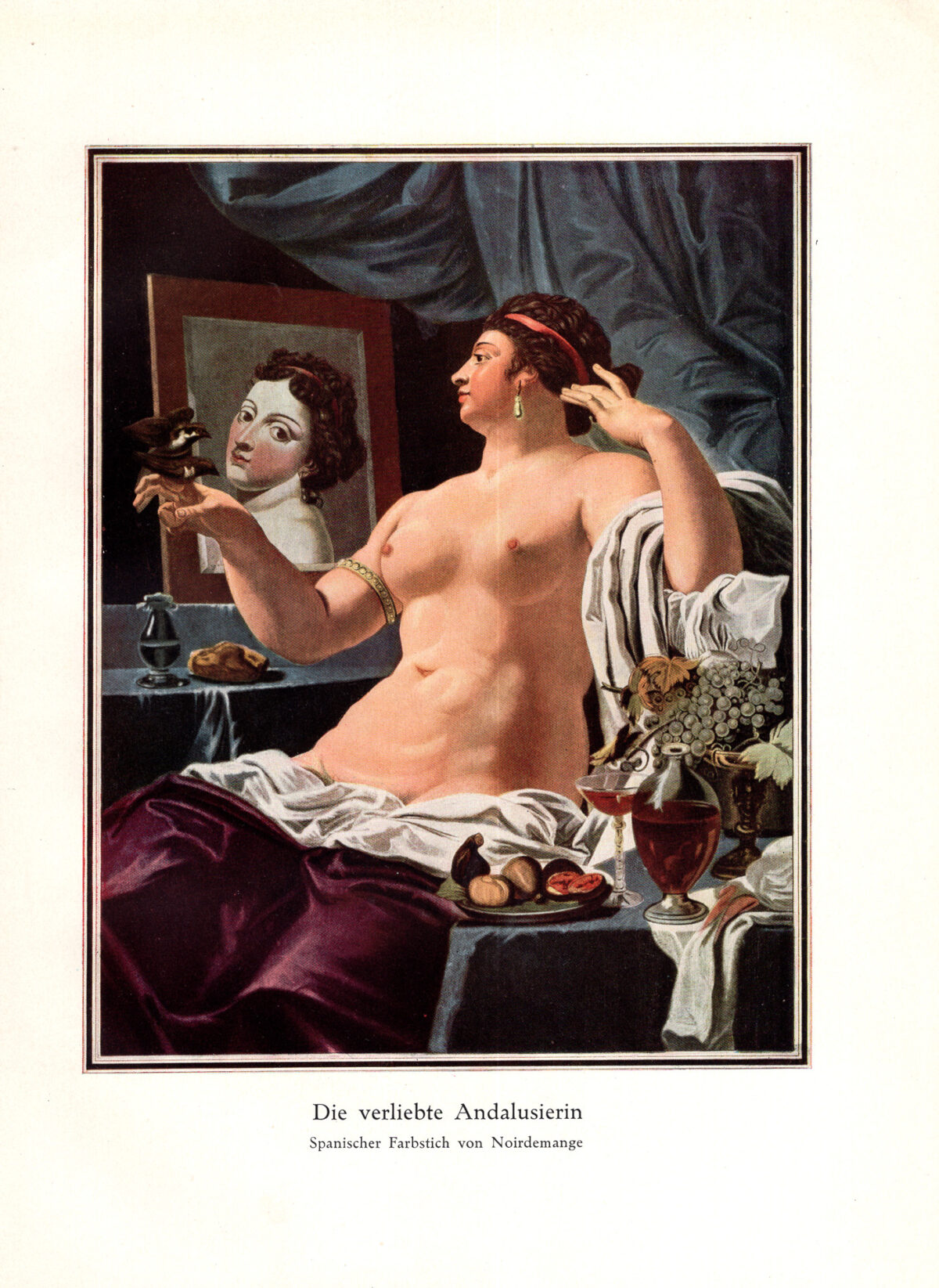 La donna andalusa innamorata Incisione a colori spagnola di Noirdemange