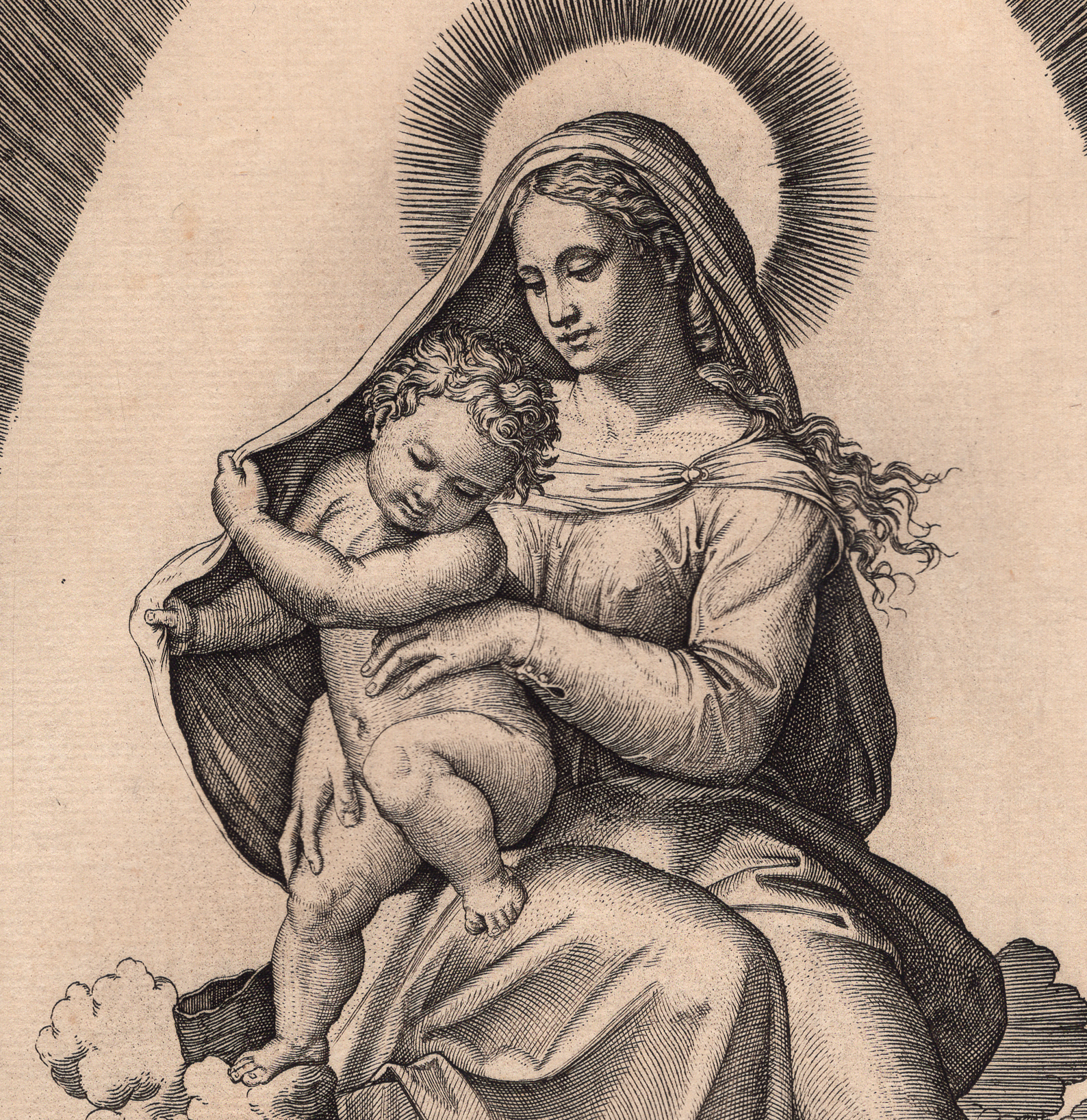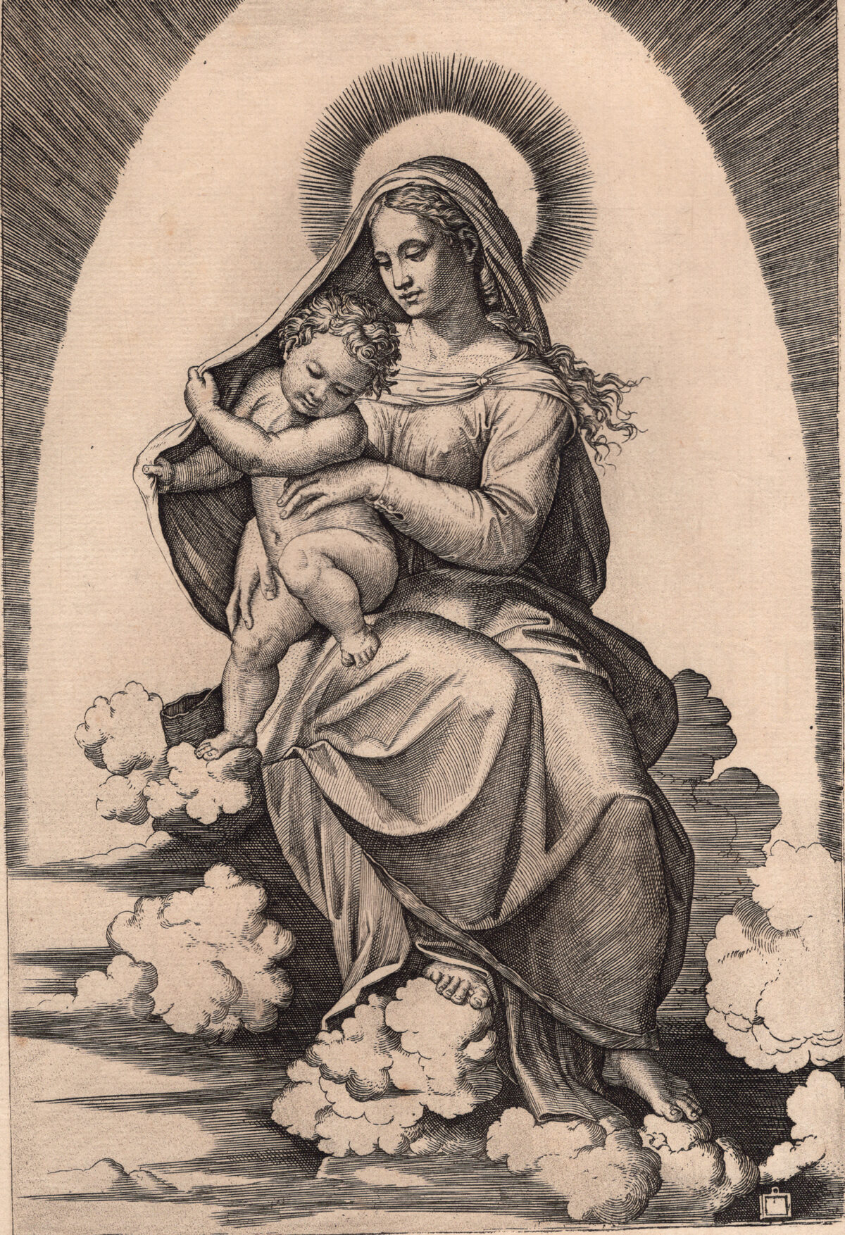 La Madonna seduta sulle nuvole, con il Bambino Salvatore in braccio da uno studio di Raffaello; di Marcantonio Raimondi; 1490-1534 circa.