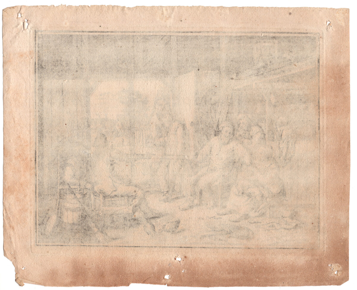 Misura cm. 16×21 alla battuta del rame su foglio cm. 19×24. Foglio un po scurito con qualche lieve macchia.