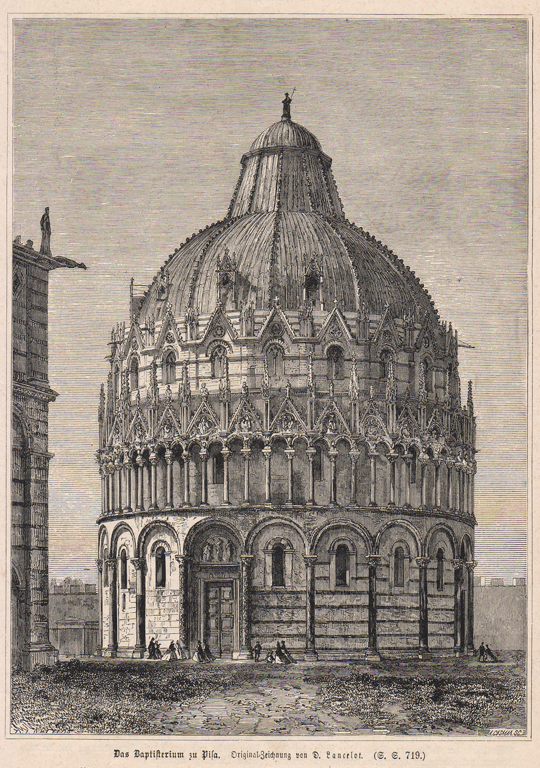 Cette gravure sur bois présente une belle vue décorative et animée du Baptistère de Pise.