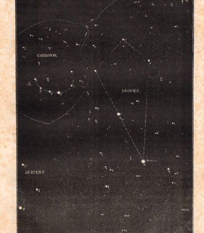 Questa affascinante stampa xilografica illustra una rappresentazione antica delle costellazioni, accompagnata da testo descrittivo. L’incisione è parte di una pagina originale del celebre trattato astronomico di Flammarion, autore noto per la sua opera di divulgazione scientifica. La pagina ha testo intorno all’immagine e sul verso.