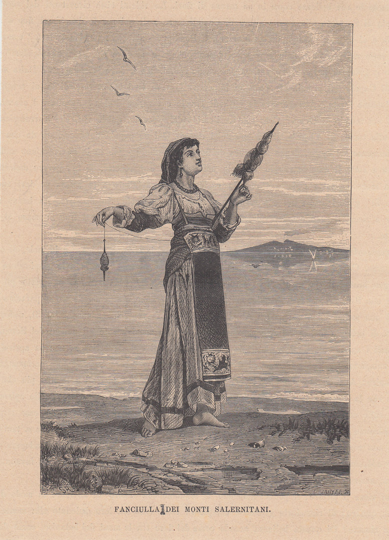 Incisione xilografica acquarellata a mano, tratta dall’opera Neapel und seine Umgebung di Rudolf Kleinpaul, pubblicata a Lipsia nel 1884.