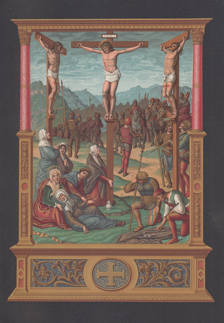 Crocifissione. Le tre croci è una cromolitografia del 1877 che rappresenta un momento toccante della Passione di Cristo.
