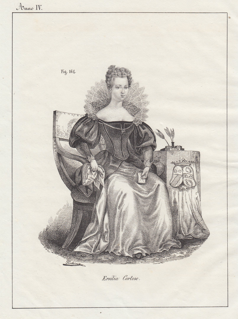 Questa opera rappresenta la figura di Ersilia Cortese, una letterata italiana di grande rilievo, nata a Roma nel 1529 e deceduta nel 1587.