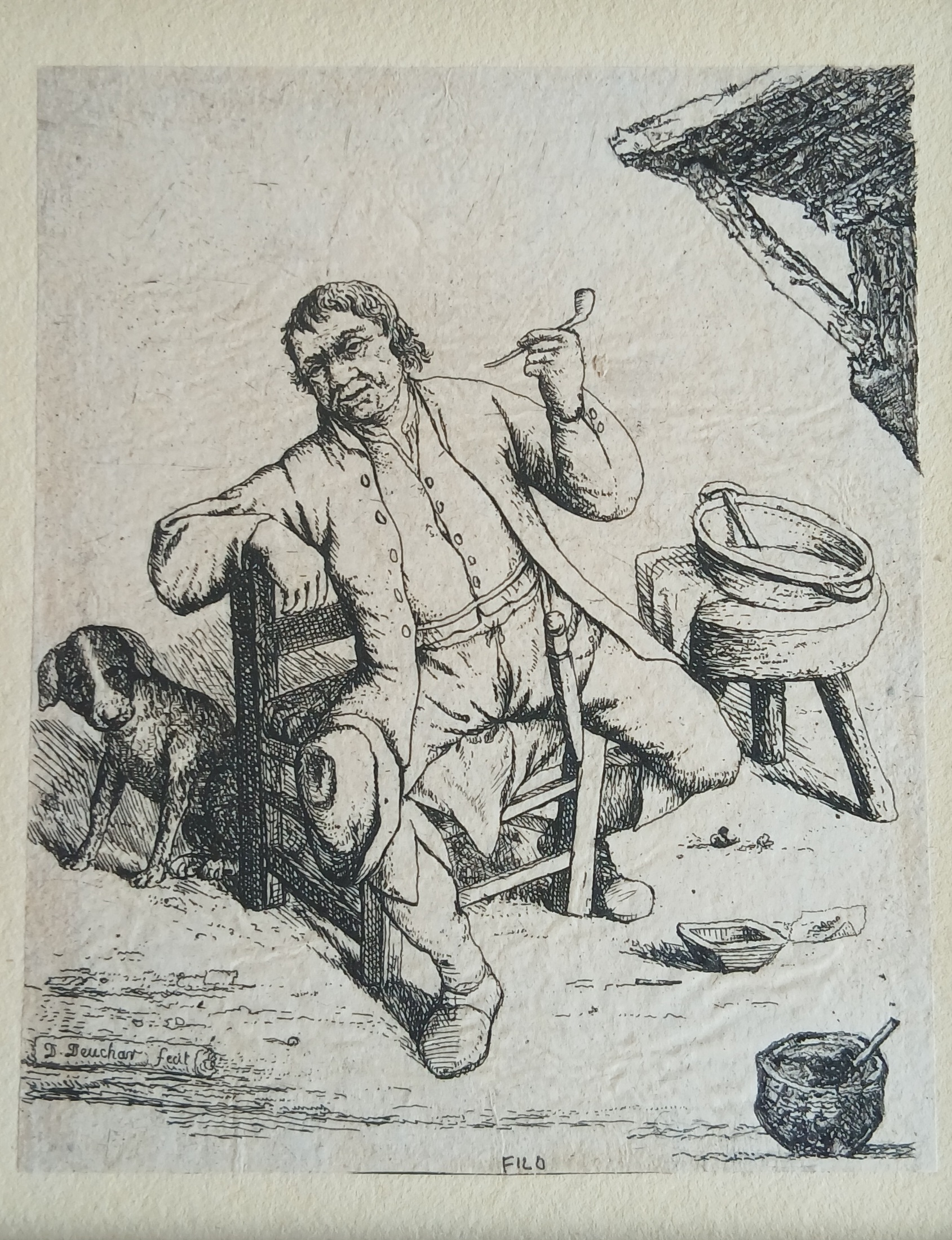 Interessante acquaforte derivata da una composizione del celebre maestro olandese Adriaen Van Ostade (1610-1685), interprete raffinato della vita popolare del XVII secolo. La stampa fu successivamente tradotta in acquaforte dall’incisore scozzese David Deuchar (1743-1808), noto per le sue copie e reinterpretazioni dei grandi maestri della grafica olandese.