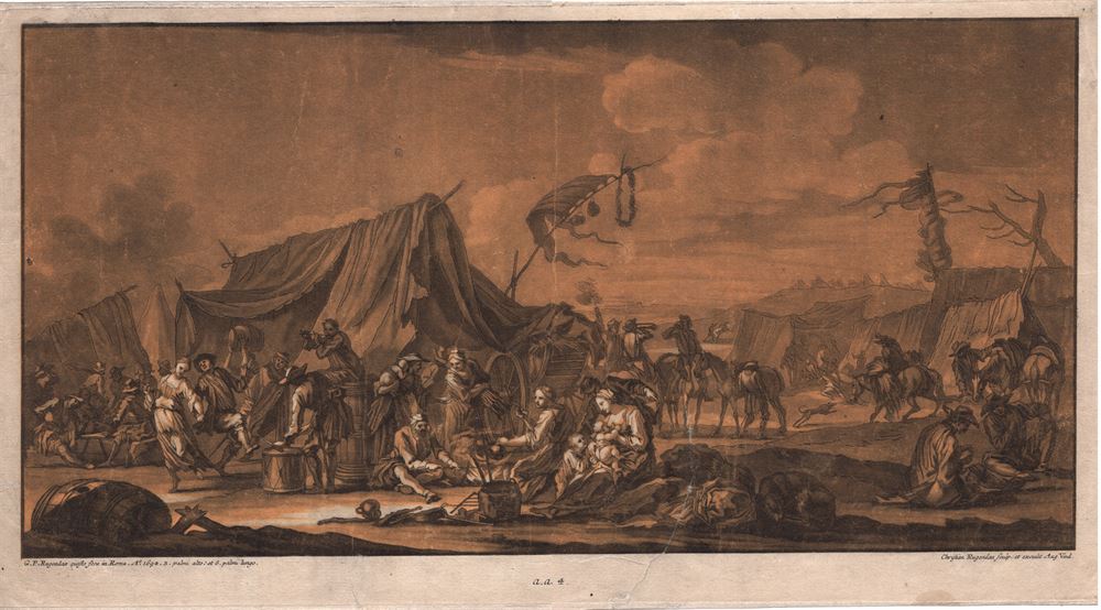 Sotto il bordo dell’immagine si legge: (a sinistra) “G. P. Rugendas questo fece in Roma Ao. 1694.”; (a destra) “Christiano Rugendas sculp. et excudit. Aug Vind”.