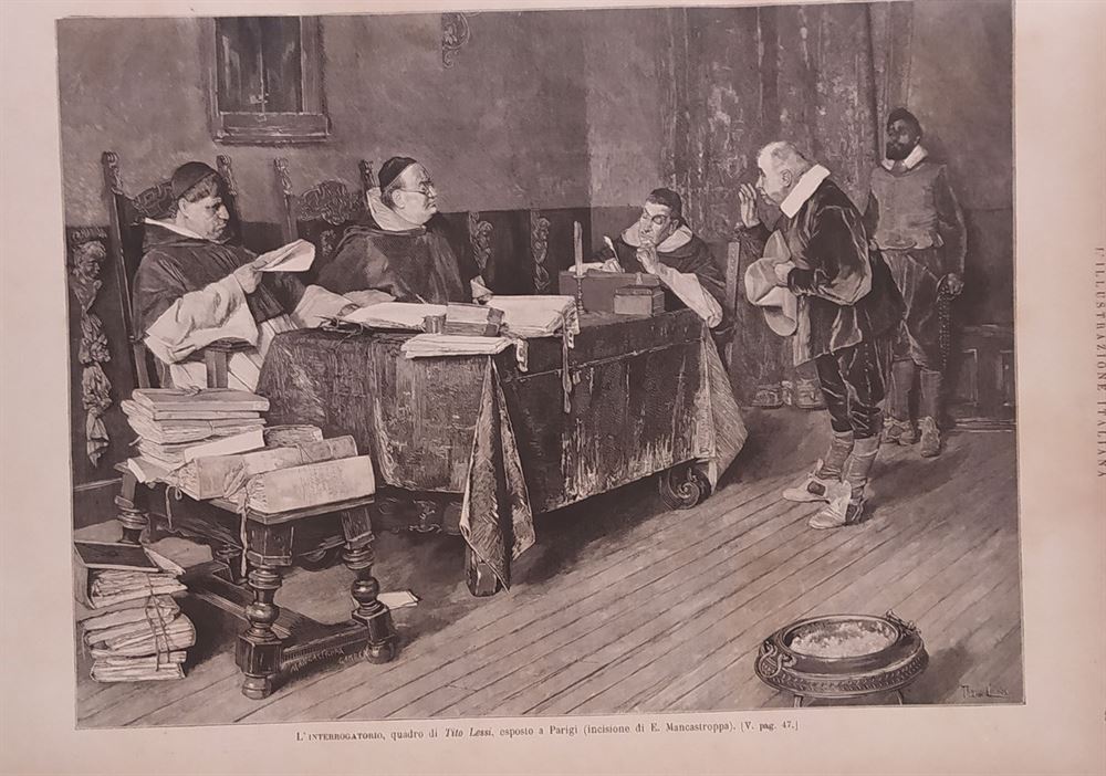 L’Interrogatorio è un’incisione realizzata da Tito Lessi nel 1886, pubblicata nell’illustre periodico Illustrazione Italiana a Milano dai Fratelli Treves Editori.