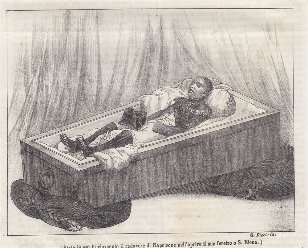 Napoleone, 1841 è una litografia che rappresenta lo stato in cui fu rinvenuto il cadavere di Napoleone all’apertura del suo feretro a S.Elena.