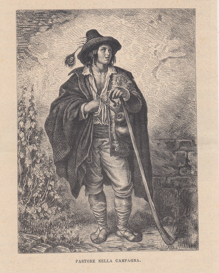 Pastore della Campagna è una xilografia realizzata nel 1885, tratta dall’opera Italia Viaggio Pittorico dall’Alpi all’Etna di G. Stieler, E. Paulus e W. Kaden, pubblicata a Milano dai Fratelli Treves.