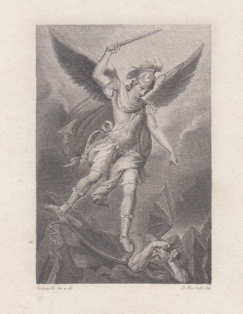Questa opera, firmata da Fontanelli per l’invenzione e il disegno, e da D. Marchetti per l’incisione, presenta un’elegante rappresentazione del celebre santo.