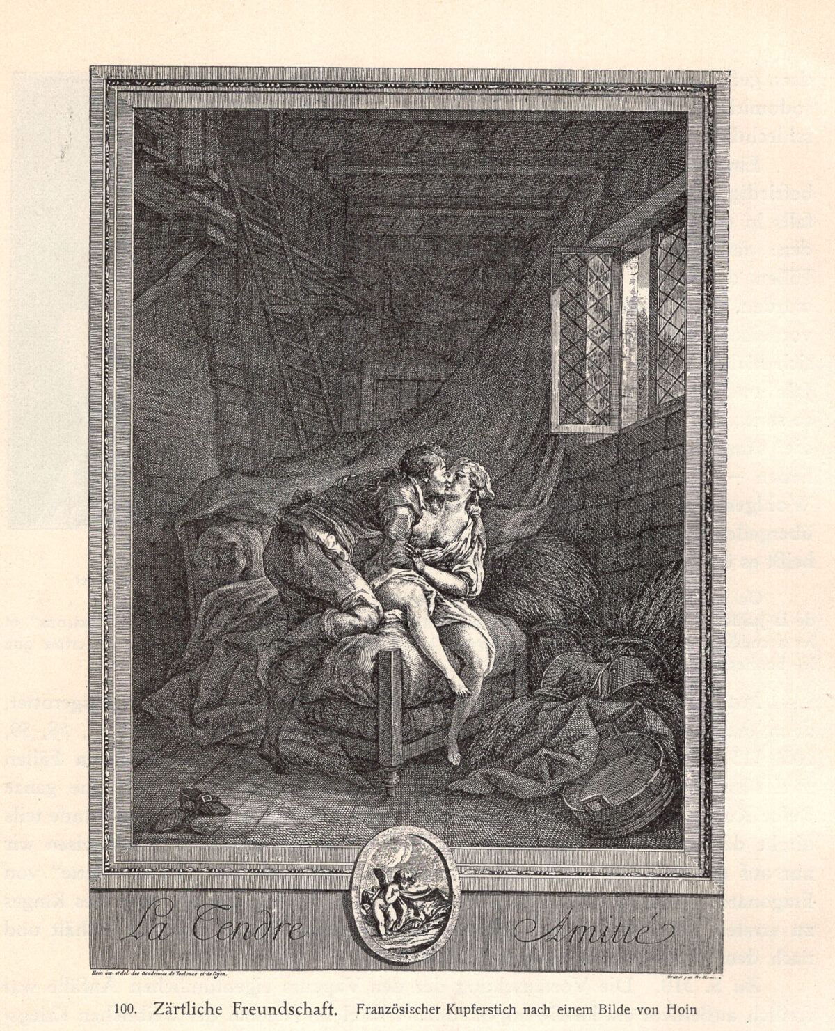 Tenera amicizia. Incisione francese su lastra di rame da un dipinto di Hoin stampa erotica